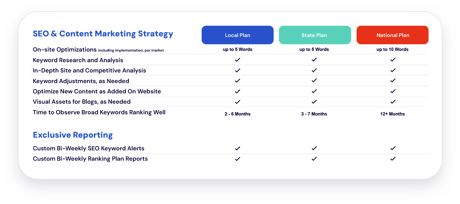National SEO Packages are for businesses that service nationwide and have a much larger service area radius. National SEO packages will focus on relevancy in search terms, backlinks, and usually combine efforts with PPC Services if you have nationwide competitors.